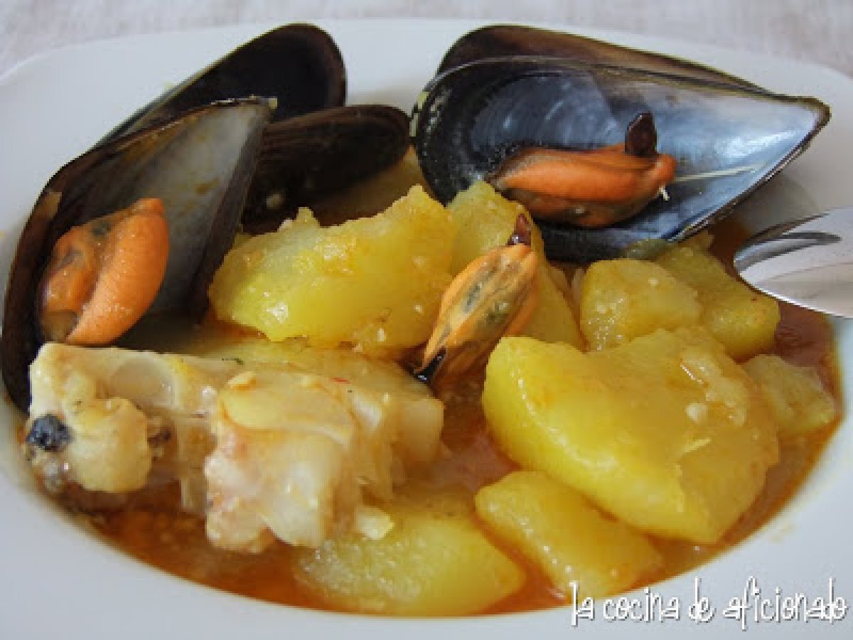 Suquet de merluza con patatas y mejillones PlatoFácil33 min662 Kcal Enviar esta receta a un amigo Imprimir esta página Preguntar al autor Publicar la foto de esta receta Ingredientes 4 700 g de merluza 1/2 kg de mejillones 750 g de patatas 5 cucharadas de aceite de oliva virgen extra 10 avellanas tostadas 2 rebanadas de pan frito 3 dientes de ajo 1 cucharadita de carne de pimiento choricero 250 ml de caldo de pescado 250 ml de agua Unas hebras de azafrán Sal Perejil
