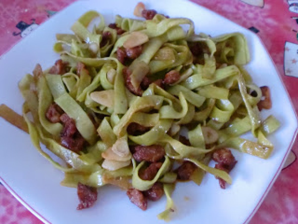 Tagliatelle espinacas con ajillo de chorizo PlatoFácil25 min1645 Kcal Enviar esta receta a un amigo Imprimir esta página Preguntar al autor Publicar la foto de esta receta Ingredientes 1 un paquete de pasta fresca unos dientes de ajo (cantidad al gusto) un chorizo fresco aceite sal Costo estimado: 2.32Euros€ (2.32€/porción)