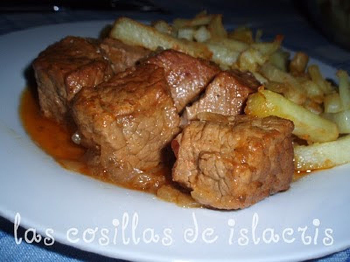 Ternera guisada sidrería asturiana PlatoFácil30 min573 Kcal Enviar esta receta a un amigo Imprimir esta página Preguntar al autor Publicar la foto de esta receta Ingredientes 3 600 g. de carne de ternera de guisar 200 g de cebolla 1 cucharadita de pimentón 80 ml. de vino blanco 1 hoja de laurel Perejil 1 guindilla 80 ml . de aceite 3 dientes de ajo Costo estimado: 11.41Euros€ (3.8€/porción)
