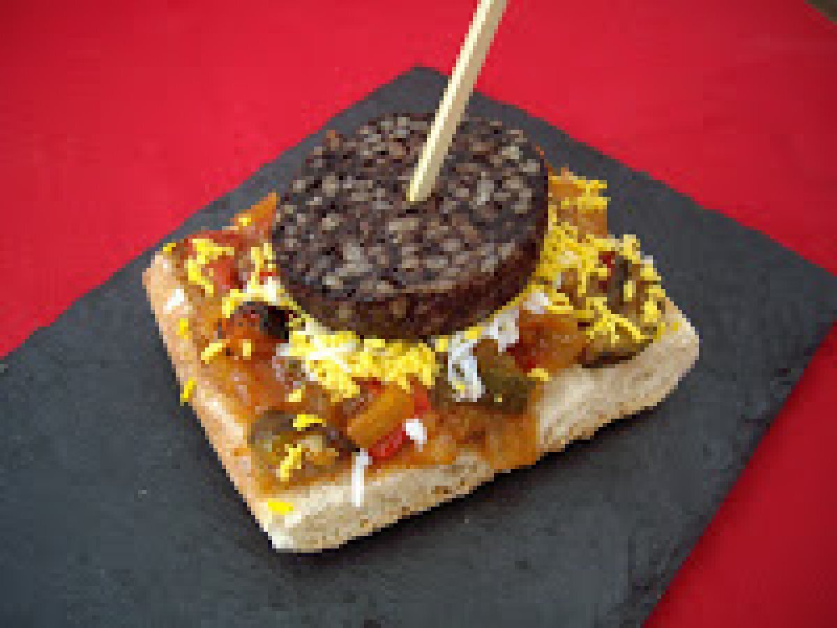 Tosta de pisto y huevo con morcilla de arroz (morcilla de burgos) vota ahora PlatoFácil50 min Enviar esta receta a un amigo Imprimir esta página Preguntar al autor Publicar la foto de esta receta Ingredientes 2 2 ó 3 huevos duros 1 morcilla de Burgos 1 cebolla 1 pimiento verde ½ pimiento rojo 2 tomates maduros 1 calabacin pequeño 2 dientes de ajo aceite de oliva sal y una pizca de azúcar