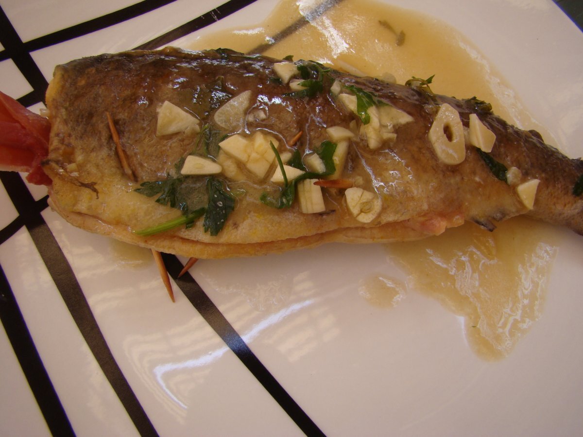 Truchas con jamón PlatoFácil25 min Enviar esta receta a un amigo Imprimir esta página Preguntar al autor Publicar la foto de esta receta Ingredientes 2 Dos truchas yo le dejo la espina central para que este mas jugosa y quito tripas y cabeza y recorto aletas bueno me lo hacen en la pescadería. Dos lonchas de jamón. Sal. Harina. Aceite. 3 dientes de ajo. Un poco de perejil. Un chorrito de vino Costo estimado: 2.89Euros€ (1.44€/porción)