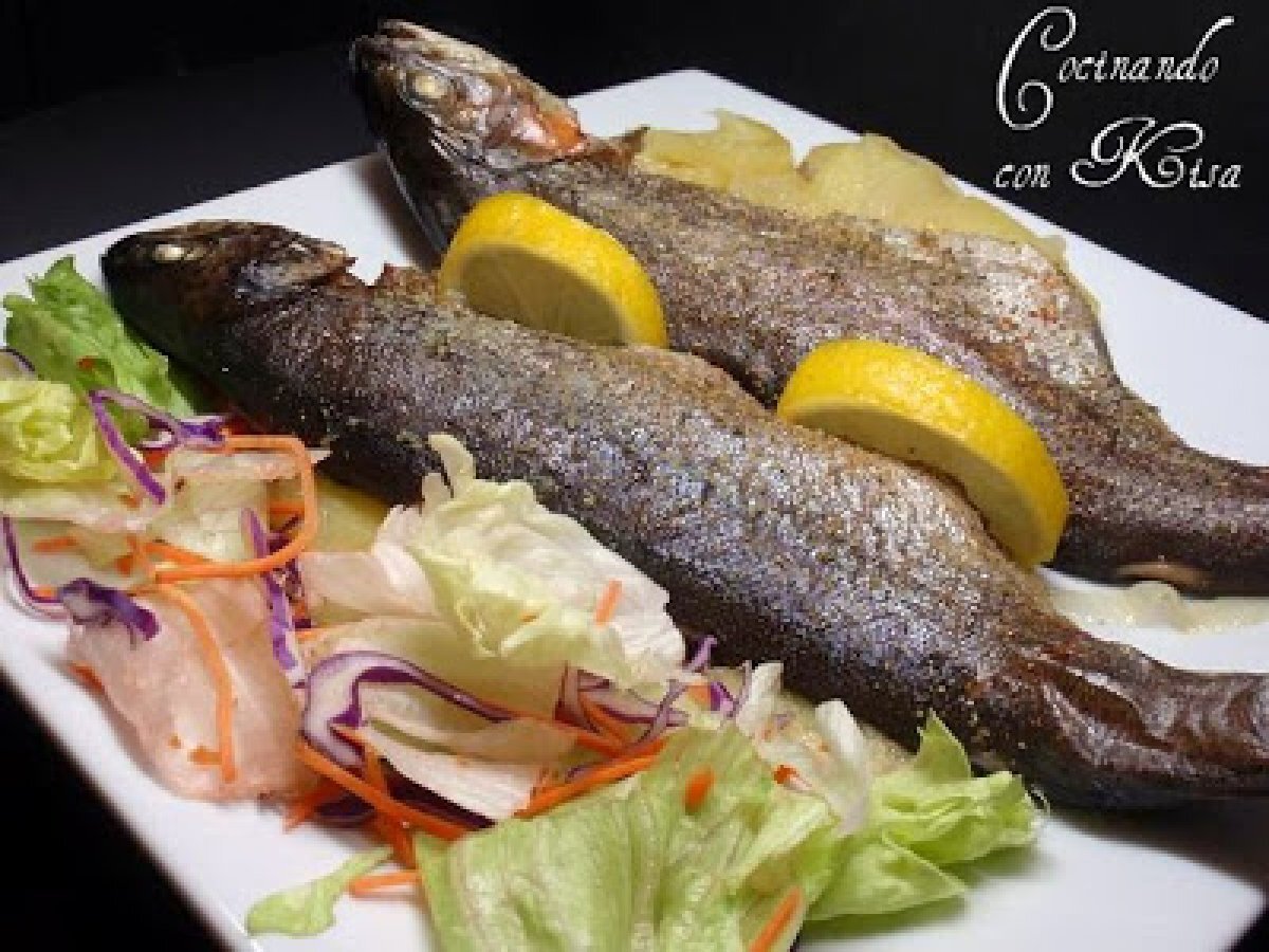 Truchas rellenas al horno (horno tradicional) PlatoFácil45 min341 Kcal Enviar esta receta a un amigo Imprimir esta página Preguntar al autor Publicar la foto de esta receta Ingredientes 6 6 truchas bien limpias y abiertas 12 lonchas de jamón serrano finas 3 patatas o 4 ½ cebolla en juliana Ajo en polvo Pan rallado Sal Pimienta negra recién molida Eneldo Aceite