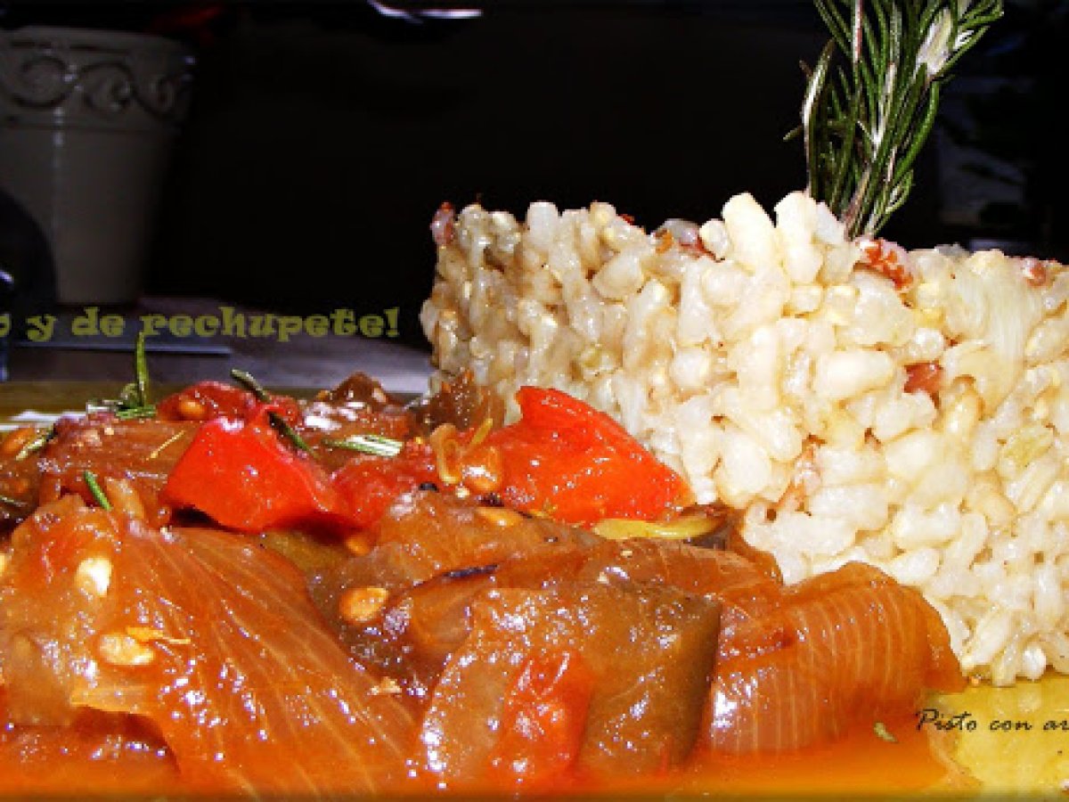 Un menú sin complicaciones: pisto con arroz integral vota ahora PlatoFácil55 min Enviar esta receta a un amigo Imprimir esta página Preguntar al autor Publicar la foto de esta receta Ingredientes 2 1 cebolla grande 1/2 pimiento rojo 1/2 pimiento verde 1 calabacín mediano 1 berenjena mediana 2 tomates grandes maduros 2 dientes de ajo machacados sal, aceite de oliva, comino en polvo y, en este caso, una ramita de romero fresco