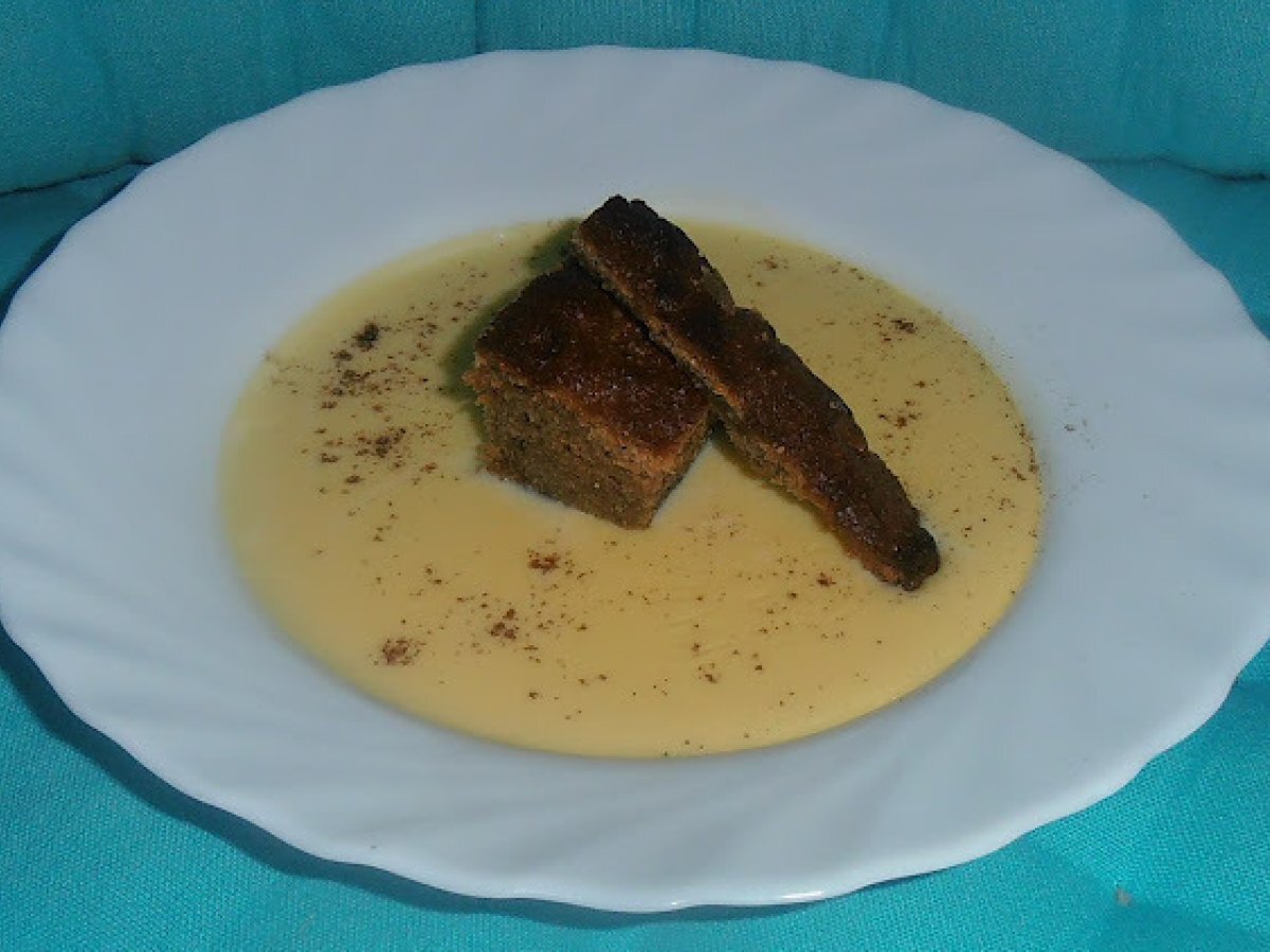Bizcocho de natillas de chocolate sobre sopa de natillas