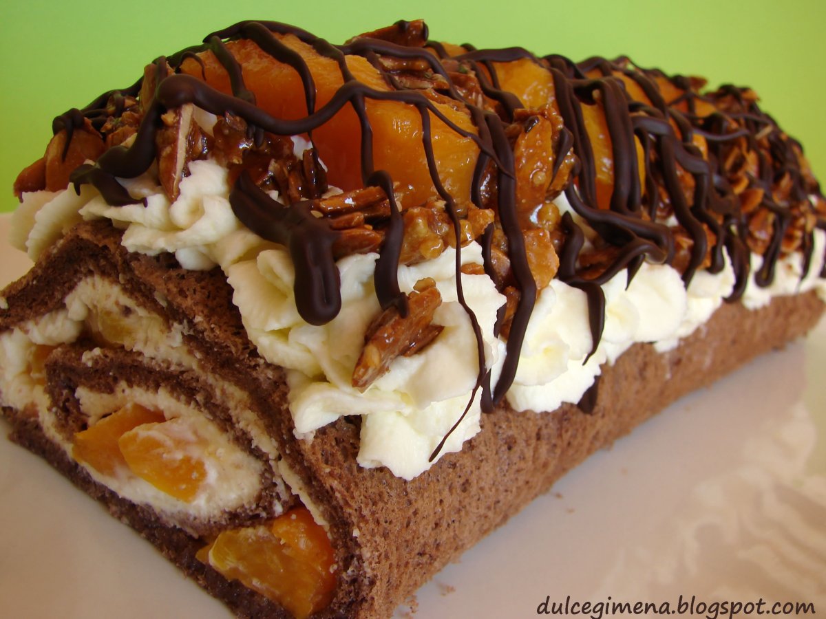 Brazo gitano de chocolate, nata, melocotones en almíbar y almendras caramelizadas PostreMedio55 min Enviar esta receta a un amigo Imprimir esta página Preguntar al autor Publicar la foto de esta receta Ingredientes 8 Para el bizcocho Huevos 3 Azúcar 30 gramos Harina 20 gramos Cacao en polvo 10 gramos Almendras acarameladas Almendras fileteadas 50 gramos Azúcar 40 gramos Melocotones 2 Mata para montar 300 gramos Azúcar 50 gramos Esencia de vainilla 1 cucharadita Chocolate cobertura para decorar a gusto (yo usé 50 gramos)