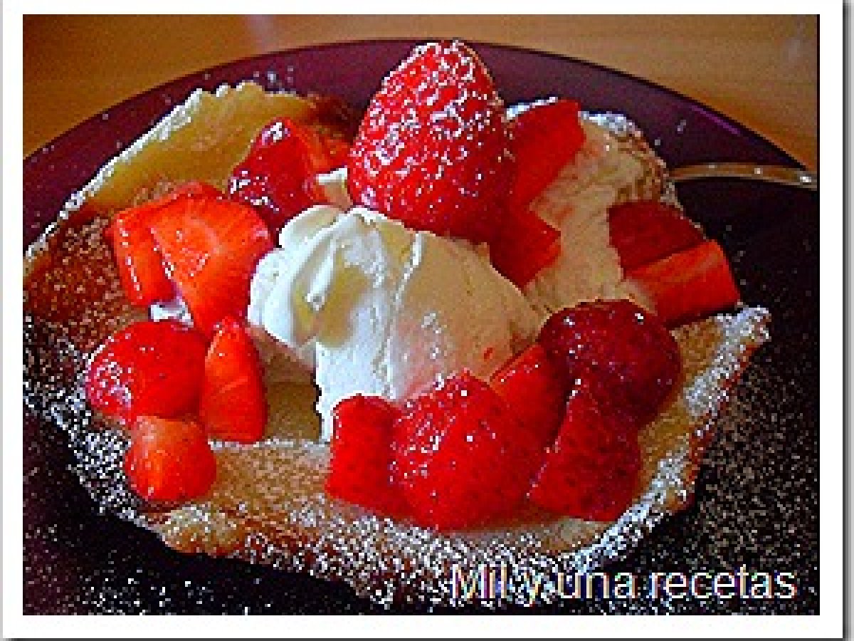 Cesta de galleta con helado de nata y fresas PostreMedio40 min177 Kcal Enviar esta receta a un amigo Imprimir esta página Preguntar al autor Publicar la foto de esta receta Ingredientes 4 40 gr de mantequilla derretida 40 gr de azúcar 1 huevo 1 pizca de sal 40 gr de harina azúcar velado Costo estimado: 0.55Euros€ (0.14€/porción)