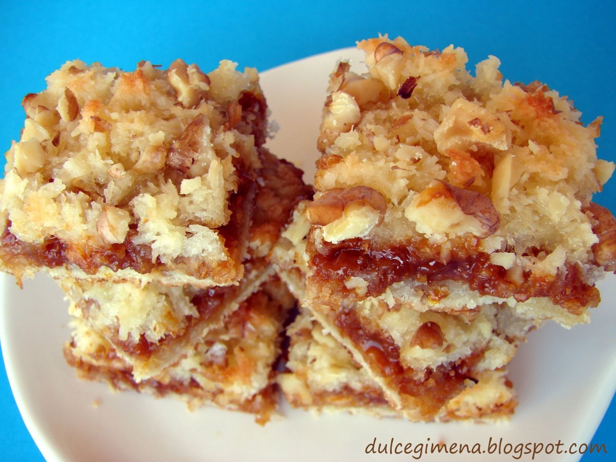 Cuadrados crocantes de dulce de leche, coco y nuez PostreMedio55 min Enviar esta receta a un amigo Imprimir esta página Preguntar al autor Publicar la foto de esta receta Ingredientes 8 Masa Azúcar 100 gramos Mantequilla 115 gramos Huevos 2 medianos harina 240 gramos Levadura en polvo 5 gramos Dulce de leche 150 gramos Huevos 2 Azúcar 50 gramos Coco rallado 100 gramos Nueces picadas 80 gramos