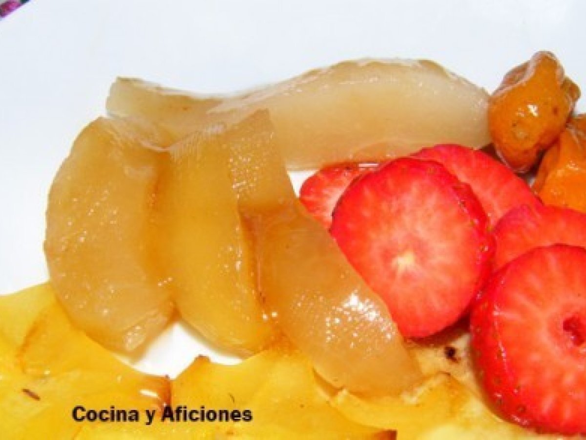 Cortamos en rodajas la carambola y las fresas. En el plato que usemos para servir colocamos un trozo de pera, varias cuñas de manzana, dos kumquats y las fresas y las rodajas de carambola al natural, lo regamos todo con el almíbar espeso. Este postre debe estar fresquito. Sencillo pero delicioso.