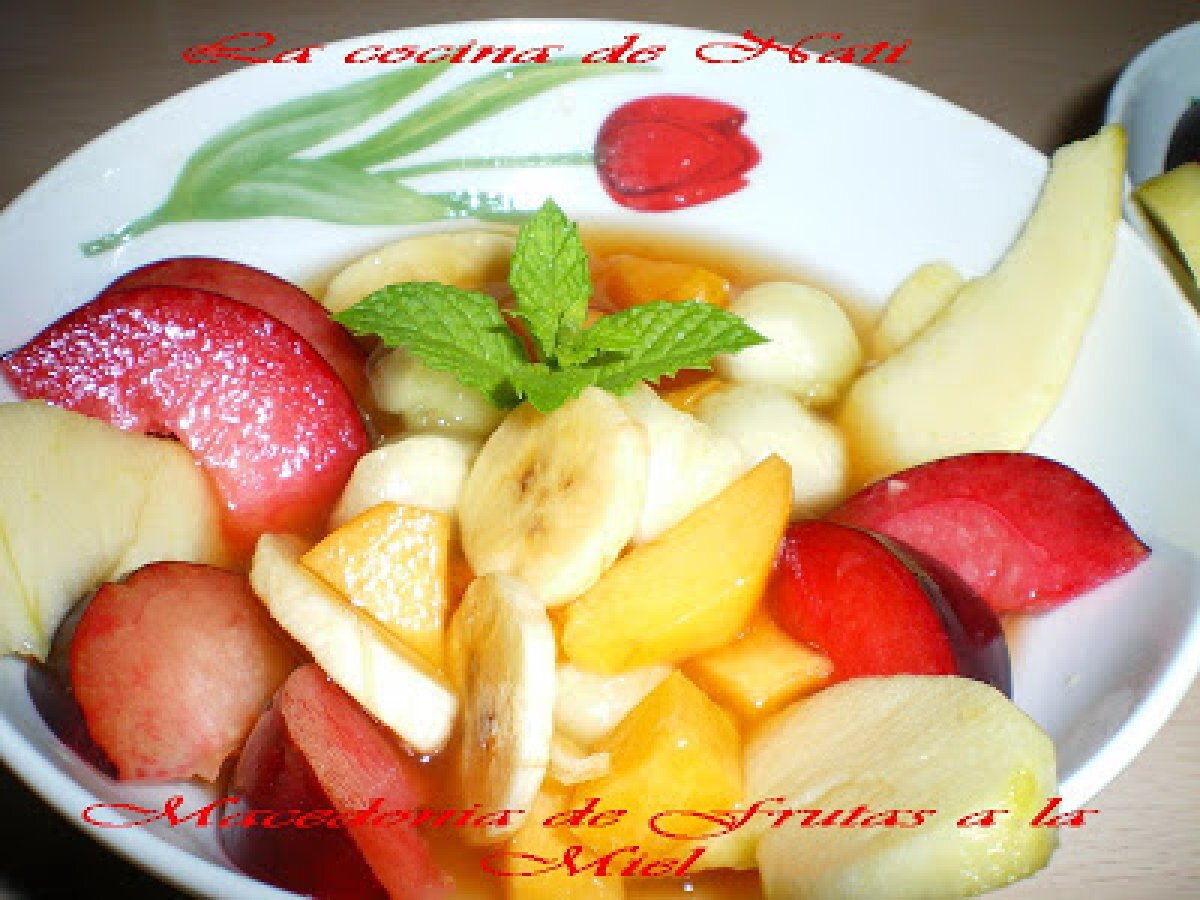 Macedonia de frutas a la miel. vota ahora PostreMedio30 min173 Kcal Enviar esta receta a un amigo Imprimir esta página Preguntar al autor Publicar la foto de esta receta Ingredientes 4 2 ciruelas. 1 melocotón. 100 g. de melón. 1 manzana. 1 plátano. 2 limones. 4 cucharadas de miel.