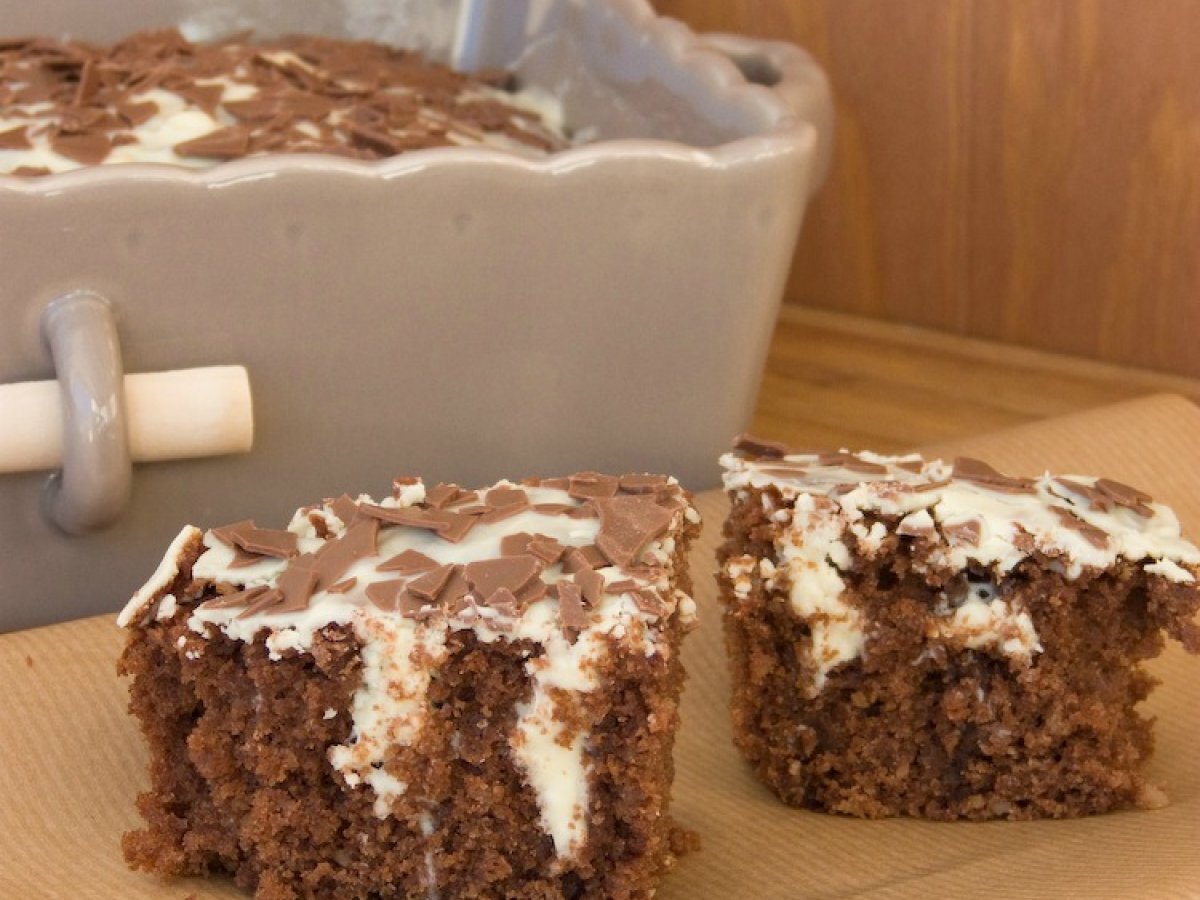 Black & White Poke Cake. Una receta americana consistente en un bizcocho de chocolate y almendra agujereado, relleno y cubierto de chocolate blanco