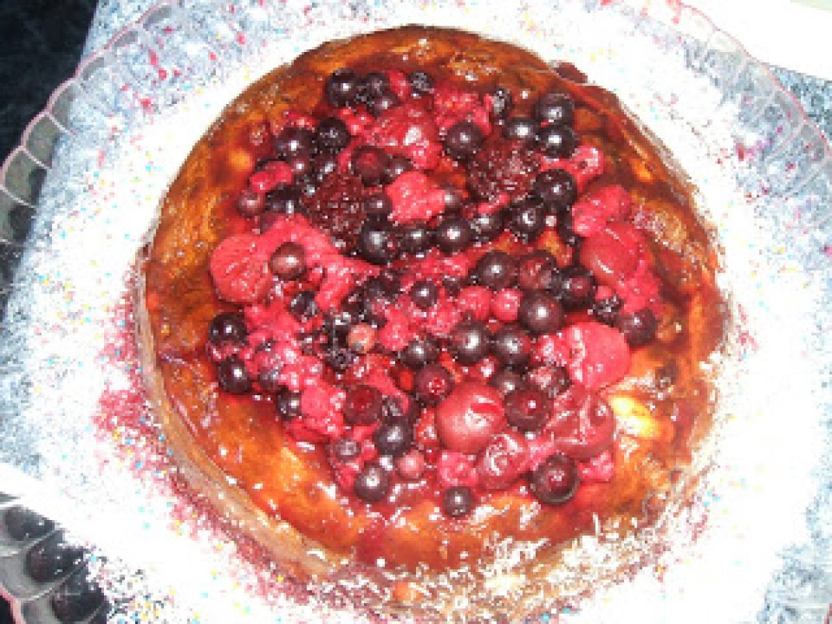 Tarta de queso con almendras, piñones, pasas y frutas del bosque