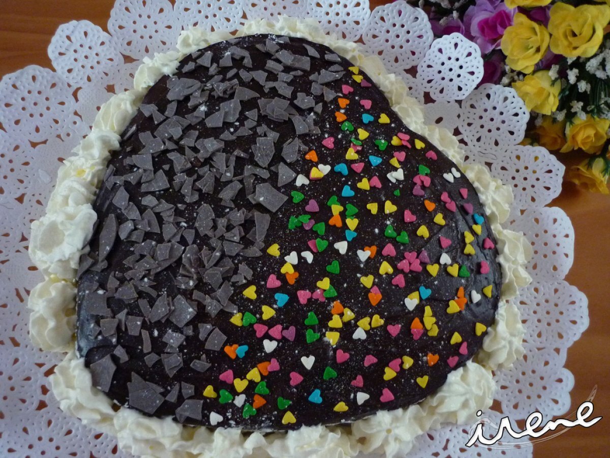 Tarta san valentín de chocolate vota ahora PostreMedio50 min Enviar esta receta a un amigo Imprimir esta página Preguntar al autor Publicar la foto de esta receta Ingredientes 8 1) PARA EL BIZCOCHO: 200 gr de harina 250 gr de azúcar 4 huevos pequeños 100 gr de almendra molida 1/2 sobre de levadura royal 175 ml de leche 150 ml de aceite de girasol 3 cucharadas de cacao 2 cucharadas de pepitas de chocolate Mantequilla para engrasar el molde Nata para decorar Almíbar PARA EL RELLENO: Flan de chocolate 2) 2oo gr de chocolate para cobertura 80 gr de mantequilla