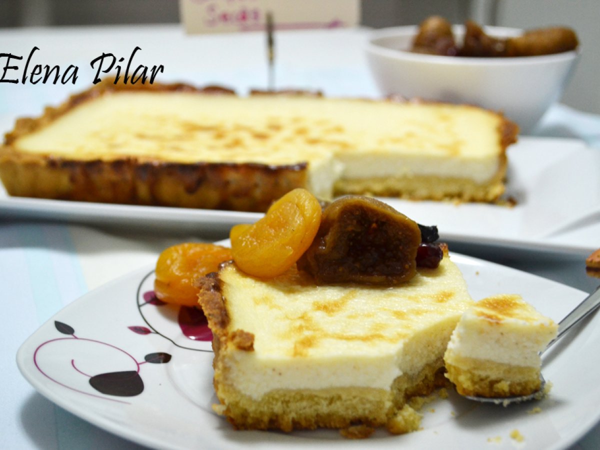 Una tartaleta súper crujiente rellena de crema de requesón y queso cremoso, y acompañada por una dulce y exquisita compota de orejones, higos secos y frutos rojos deshidratados