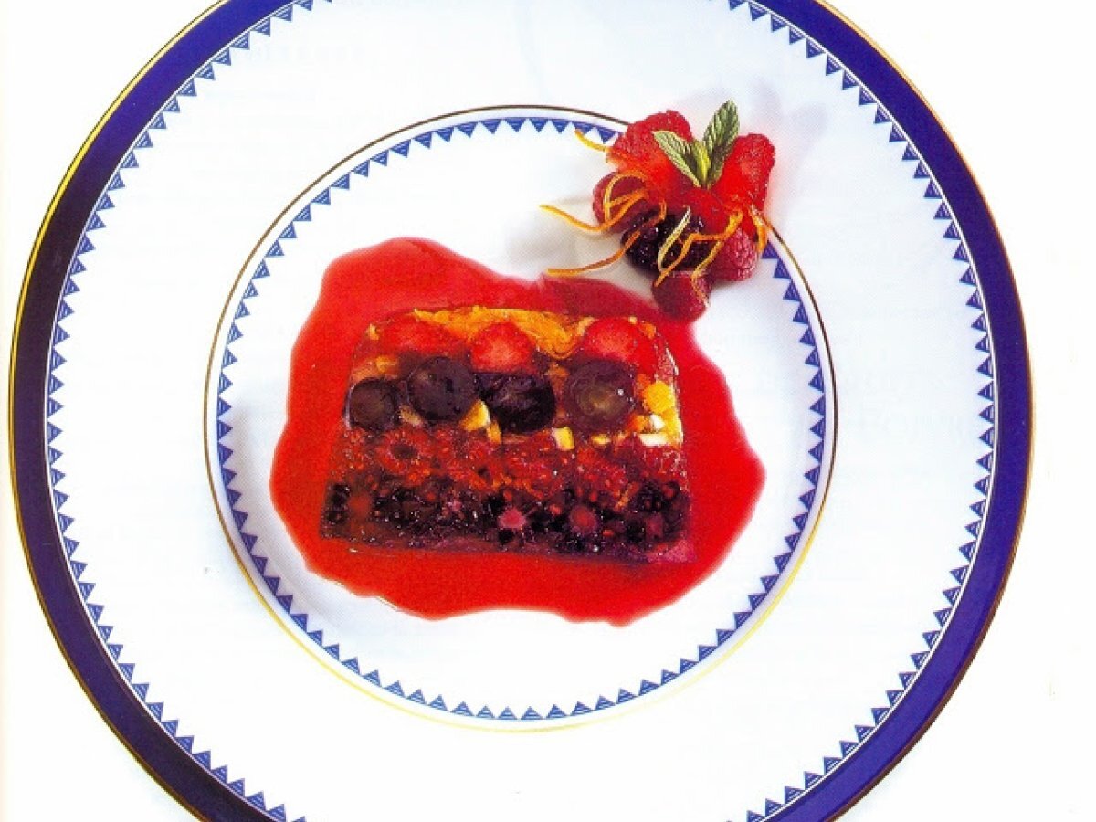 Terrina de frutas y gelatina de miel le cordon bleu PostreFácil20 min212 Kcal Enviar esta receta a un amigo Imprimir esta página Preguntar al autor Publicar la foto de esta receta Ingredientes 4 La cáscara de una naranja cortada en juliana 250 g de fresas 1 canastilla de frambuesas 1 canastilla de moras 1 racimo de uvas negras sin semillas Para la gelatina de miel; 1 cucharada de miel 750 ml. de agua 150 g de azúcar 8 hojas de menta 12 placas de gelatina remojas en agua fría