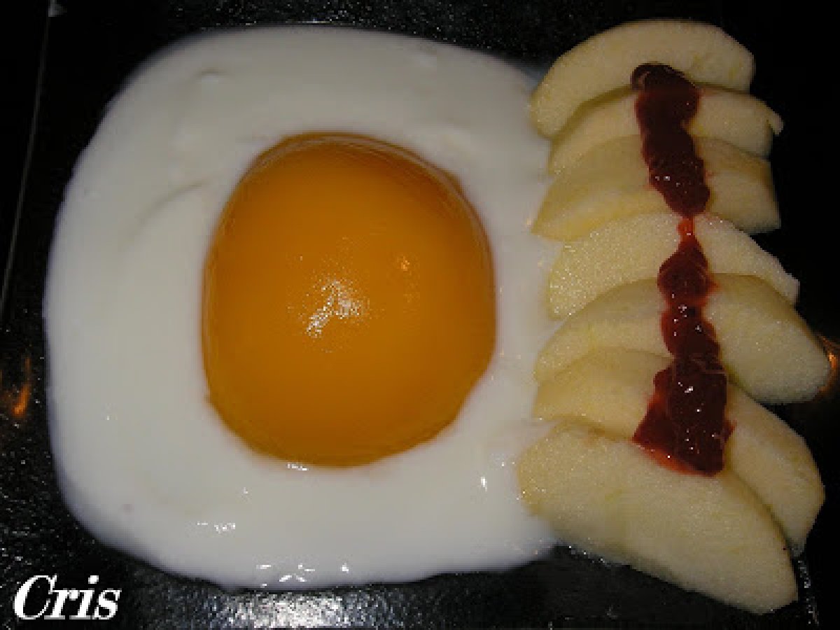 Tenemos allí un postre un huevo al plato con patatas y del ketchup
