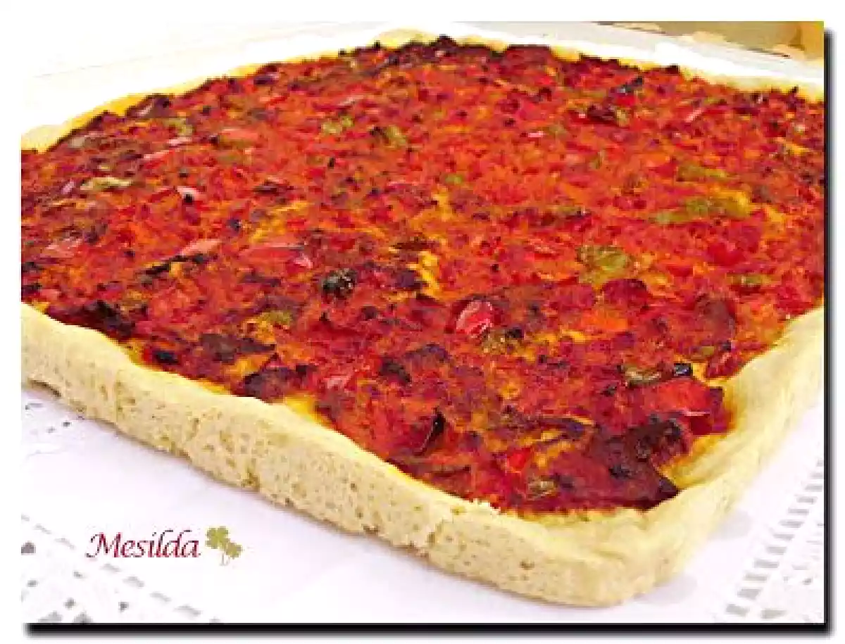 Ingredientes: Para la masa: 1/2 kg, de harina, 1 vaso de agua tibia, 1 cucharadita de sal, 25 gr de levadura fresca, 1/2 vaso de aceite de oliva suave; Para el sofrito: 1 pimiento rojo y uno verde, 800 gr de tomate picado sin piel, 1latita de atún y sal.