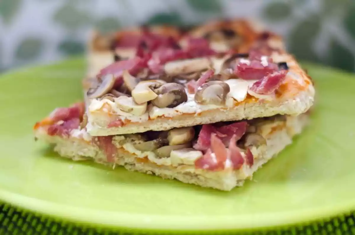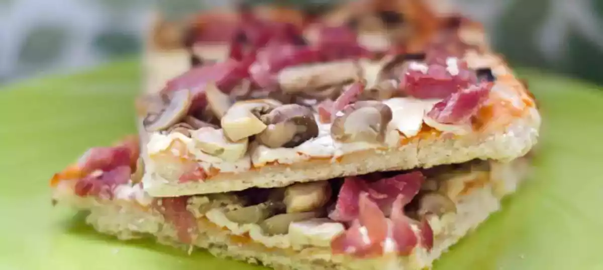 Ingredientes: 50 gr de aceite de oliva, 100 gr de agua, 20 gr de levadura fresca, 300 gr de harina de fuerza, 1 cdita de sal, un pelín de azúcar, 50 gr de manteca de cerdo, 200 gr de jamón york, 1 lata de champiñones y queso en lonchas.