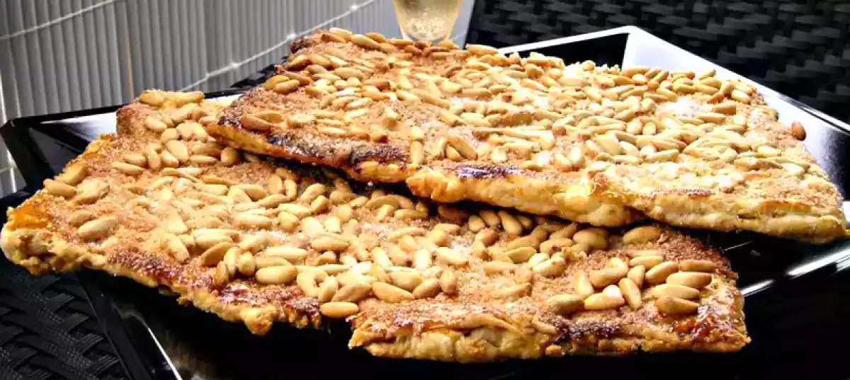Ingredientes: 2 placas de hojaldre, 1 paquete de llardons (Chicharrones), 1 paquete pequeño de piñones natural, 1 yema de huevo, 5 cdas s de azúcar.