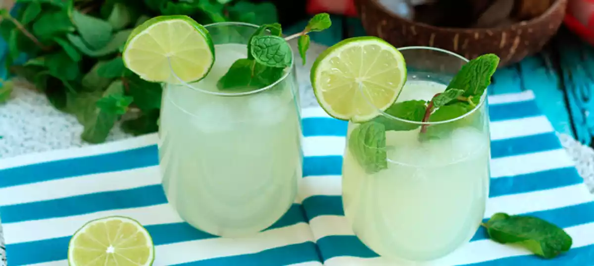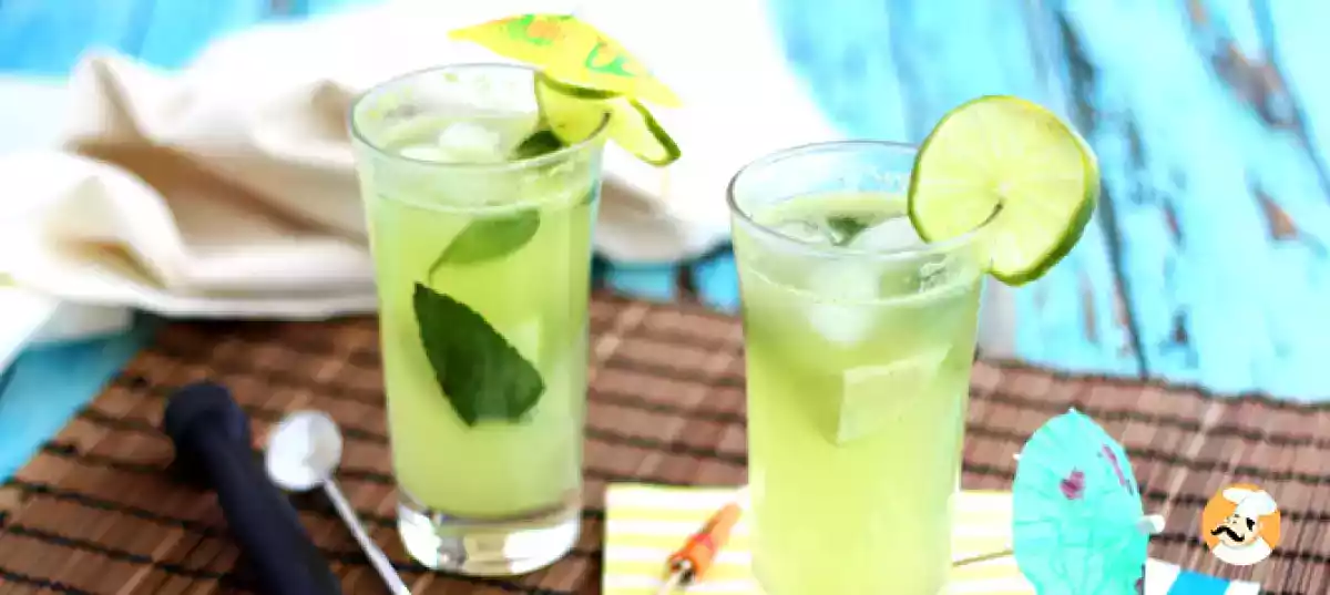 ► Ingredientes: 1 pepino, 1 manojo de menta, 2 limas, 750 ml de gaseosa o agua con gas, 100 ml de sirope de azúcar de caña, hielos