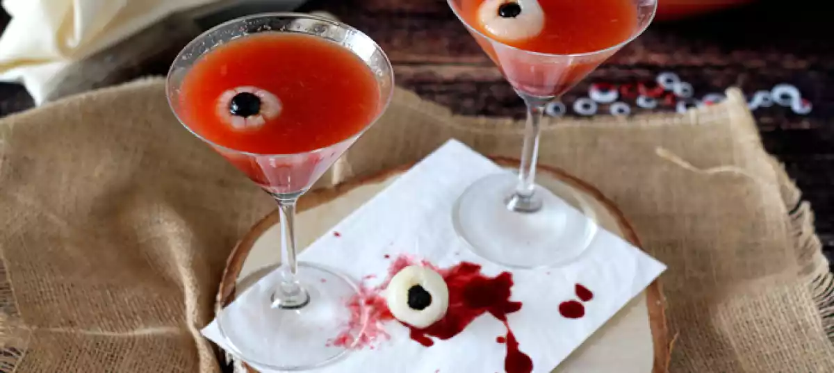 ► Ingredientes: 400 ml zumo de naranja sanguina, 700 ml gaseosa (del tipo 7 up), 50 gr puré de frutos rojos (mermelada o coulis), 50 gr de sirope de granadina, zumo de 1/2 limón, 15 gotitas de colorante rojo. Para la decoración de Halloween: 10 lichis sin hueso y 10 arándanos