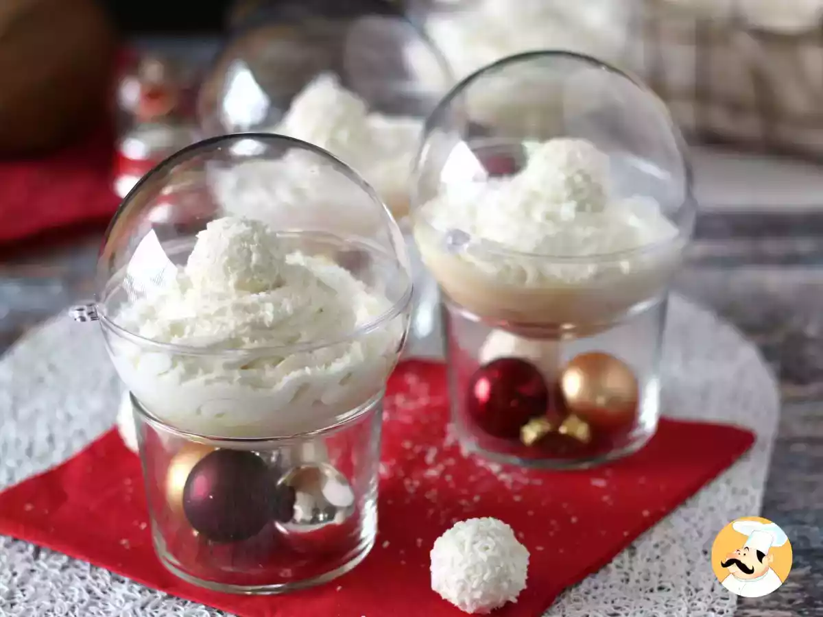 Para terminar con estilo, te sugerimos que pruebes nuestra crema con sabor a los bombones Raffaello. Pero su sabor no es lo único que merece la pena de este postre, y es que su presentación es hiper bonita. Imagina unas elegantes bolas de Navidad transparentes rellenas de una suave mousse de coco, de una sedosa crema de vainilla y ganache de chocolate blanco. Además, es un postre que no requiere encender el horno. Como ves, una receta rápida y práctica con un resultado que nunca decepciona. Perfecta si deseas impresionar a tus invitados con un postre especial.