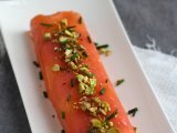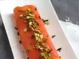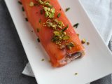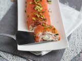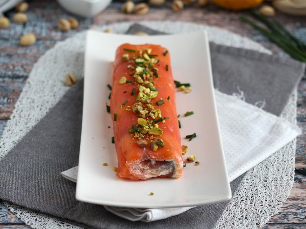 Una idea original y muy visual, perfecta para las fiestas navideñas, pero tan versátil que puede servirse durante todo el año cuando vengan invitados a cenar. Este tronco salado de salmón relleno de queso ricotta y pistachos, es un plato que entra por los ojos y luego sorprende, por su equilibrado sabor, al paladar. El relleno es una deliciosa crema de ricotta, enriquecida con crujientes trocitos de pistacho, cebollino picado y pequeños trozos de pulpa de limón, que le dan frescura y aportan un inesperado toque cítrico muy sugerente.