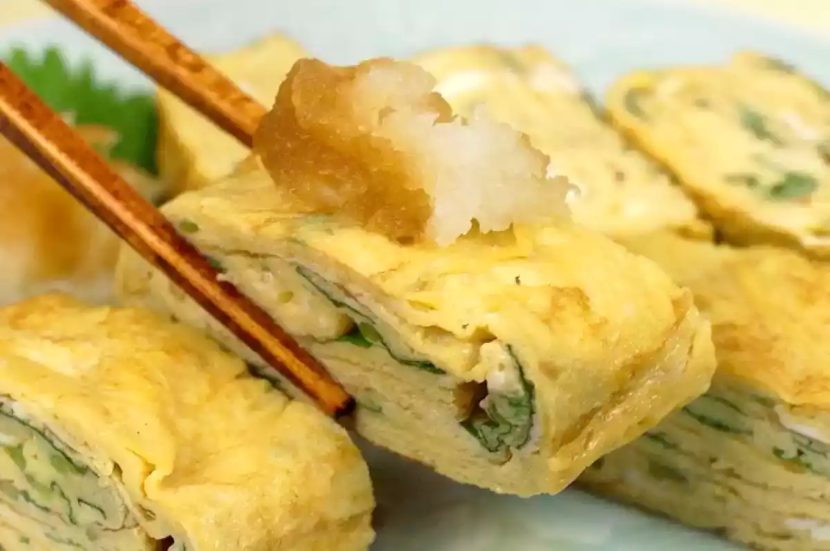 El Tamagoyaki es un plato japonés hecho a base de capas delgadas de huevo que se enrollan como una espiral (huevo batido y a la sartén). Su nombre en sí significa "huevo asado". Se suele comer sobre todo en el desayuno ya que tiene un sabor dulce por ir acompañado de caldo "dashi", soja, azúcar y sal.