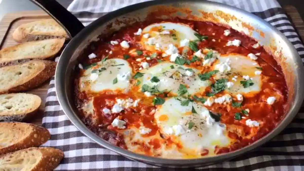 Este plato es típico tunecino. Su ingrediente principal es el huevo (como no) y la salsa de tomate. Tan solo trata de echar la salsa de tomate con los condimentos que queramos en una sartén o cazuela de barro y cuando suelte agua, hacer unos huequitos y verter los huevos. Dejarlos cocer 10-15 minutos y listo!