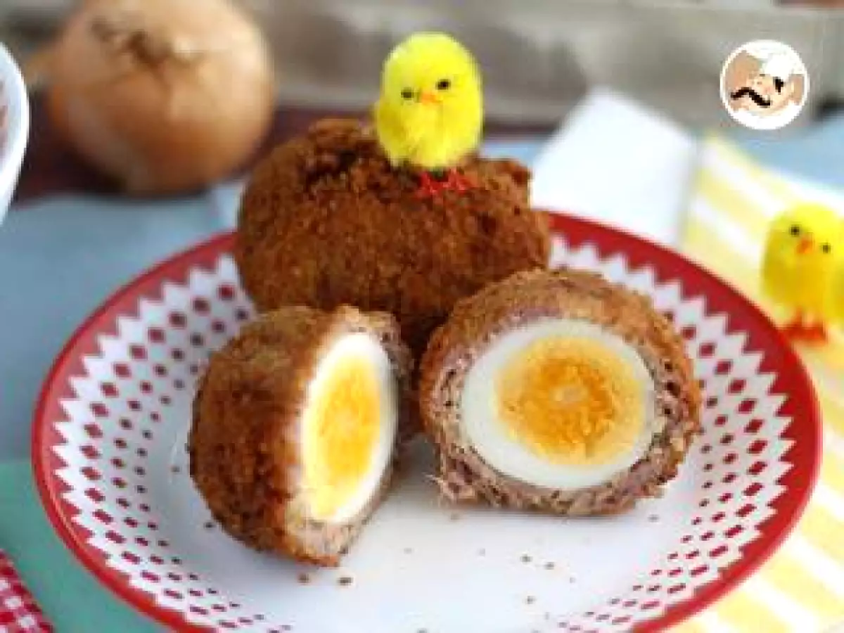 Aunque esta receta la podéis encontrar aquí, se trata de cocer los huevos, pasarlos por harina y con la carne ya sazonada y cocinada, lo hacemos una bola cubriéndolo de la carne. Después pasamos por huevo batido, pan rallado y lo freímos. Riquísimo!