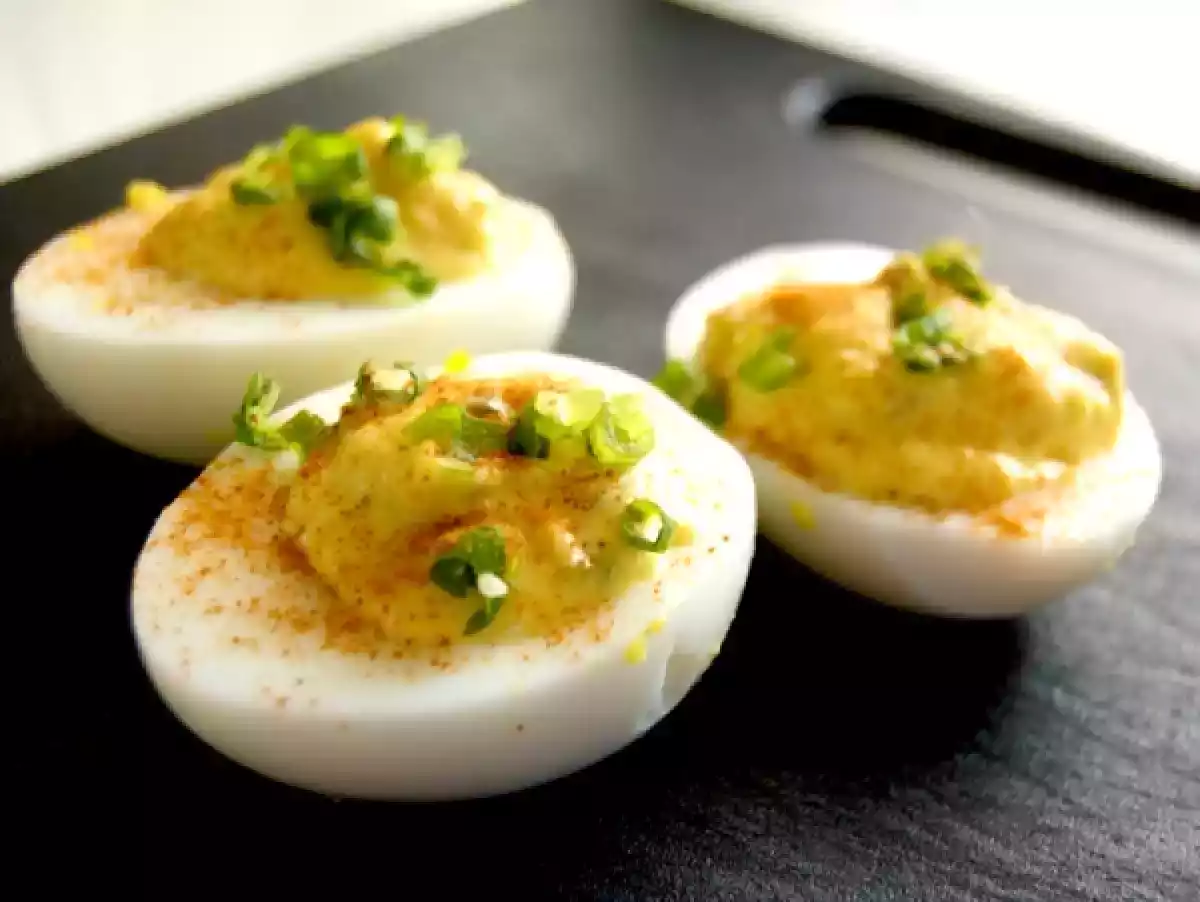 Esta es una receta muy típica de la India y encima súper sencilla! Primero, se cuecen los huevos y se cortan por la mitad. Preparamos la masa con las yemas aplastadas, mayonesa, mostaza, curry y sal y se rellenan los huevos.