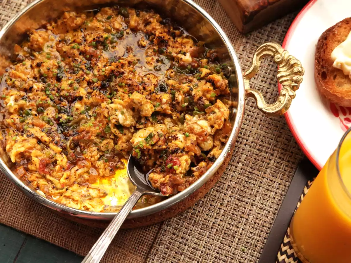 El menemen es una receta familiar turca de huevos revueltos. Se suele comer en el desayuno y cuando se hace en familia se hace un menemen grande para todos.