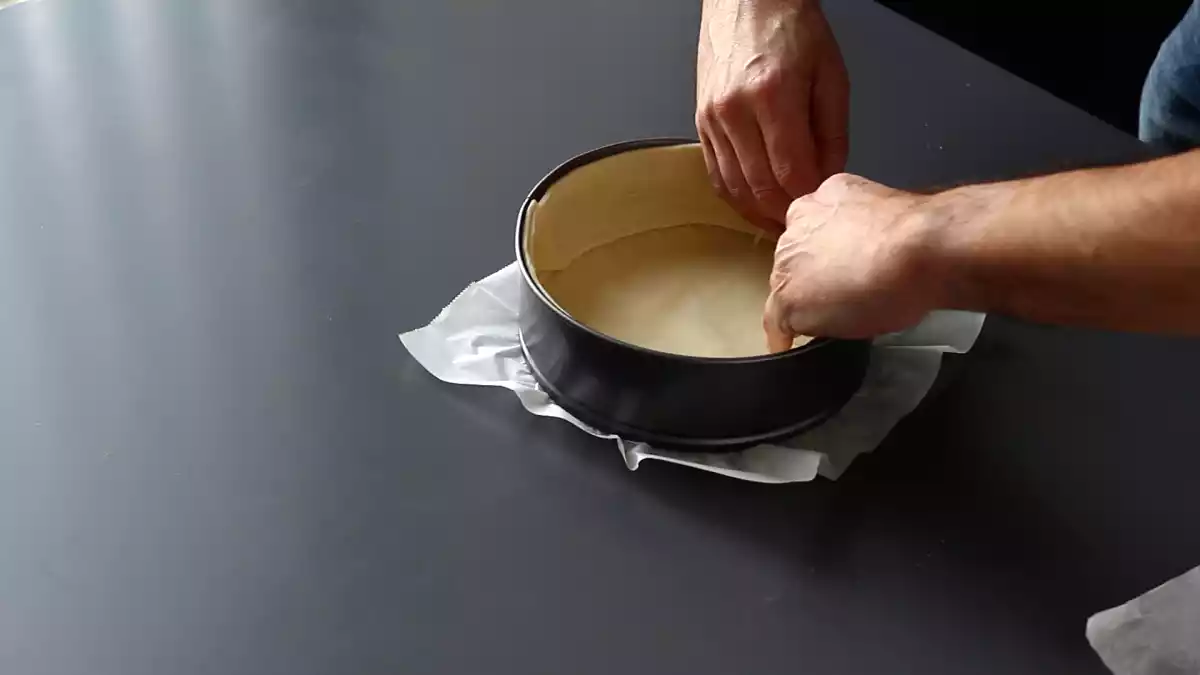Coloca la base de hojaldre: Corta un disco de masa de hojaldre del mismo tamaño que el fondo del molde y colócalo cuidadosamente dentro.