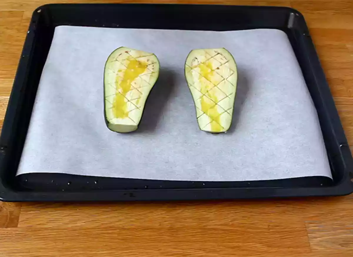 Cortar la berenjena en dos a lo largo. Colocar los trozos, con la piel hacia abajo, en la bandeja de horno, en la que habremos puesto papel sulfurizado. Hacer cortes en la parte superior (como un damero) y pincelar con aceite de oliva.