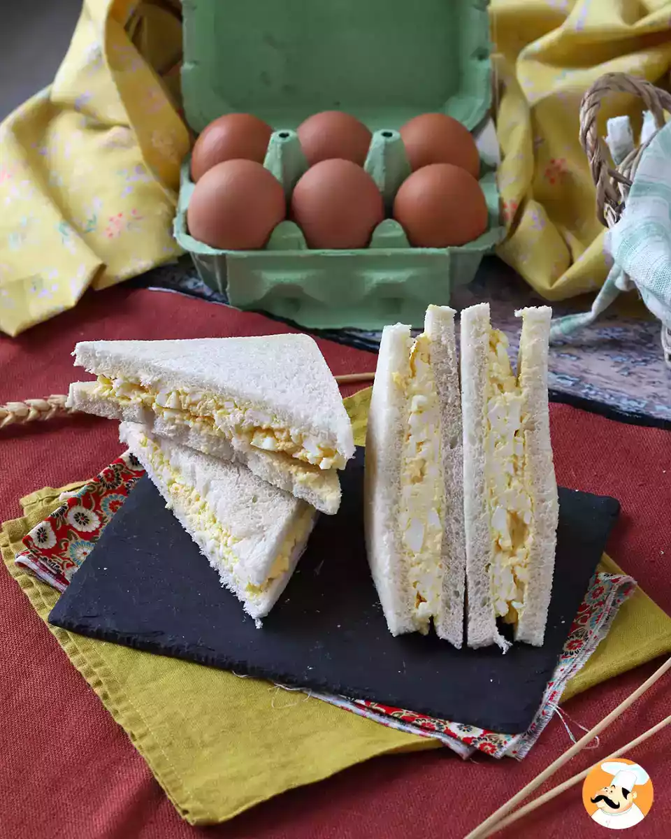 El tamago sando, el famoso sándwich de huevo japonés, es un clásico del konbini. Este sándwich, tan sencillo como irresistible, se elabora con huevos duros perfectamente cocidos, machacados hasta conseguir una consistencia cremosa y mezclados con mayonesa (la mayonesa japonesa es la mejor). Una idea excelente para salir del típico sándwich de jamón y queso o de atún y tomate.