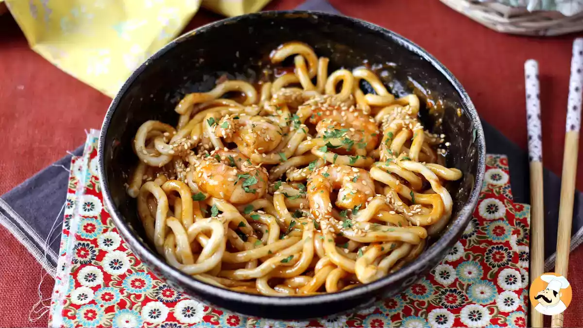 Receta completa | Udón con gambas y salsa de cacahuete picante