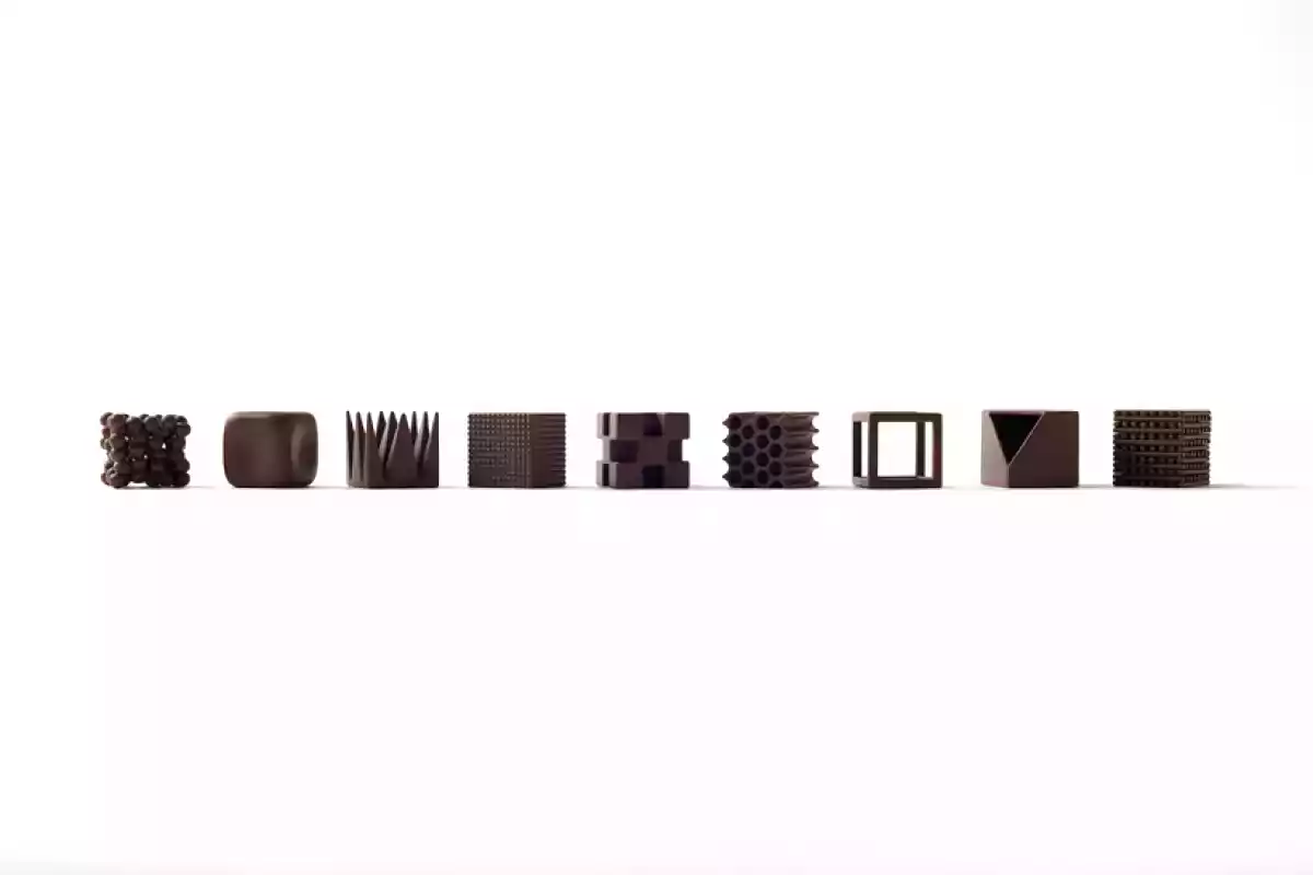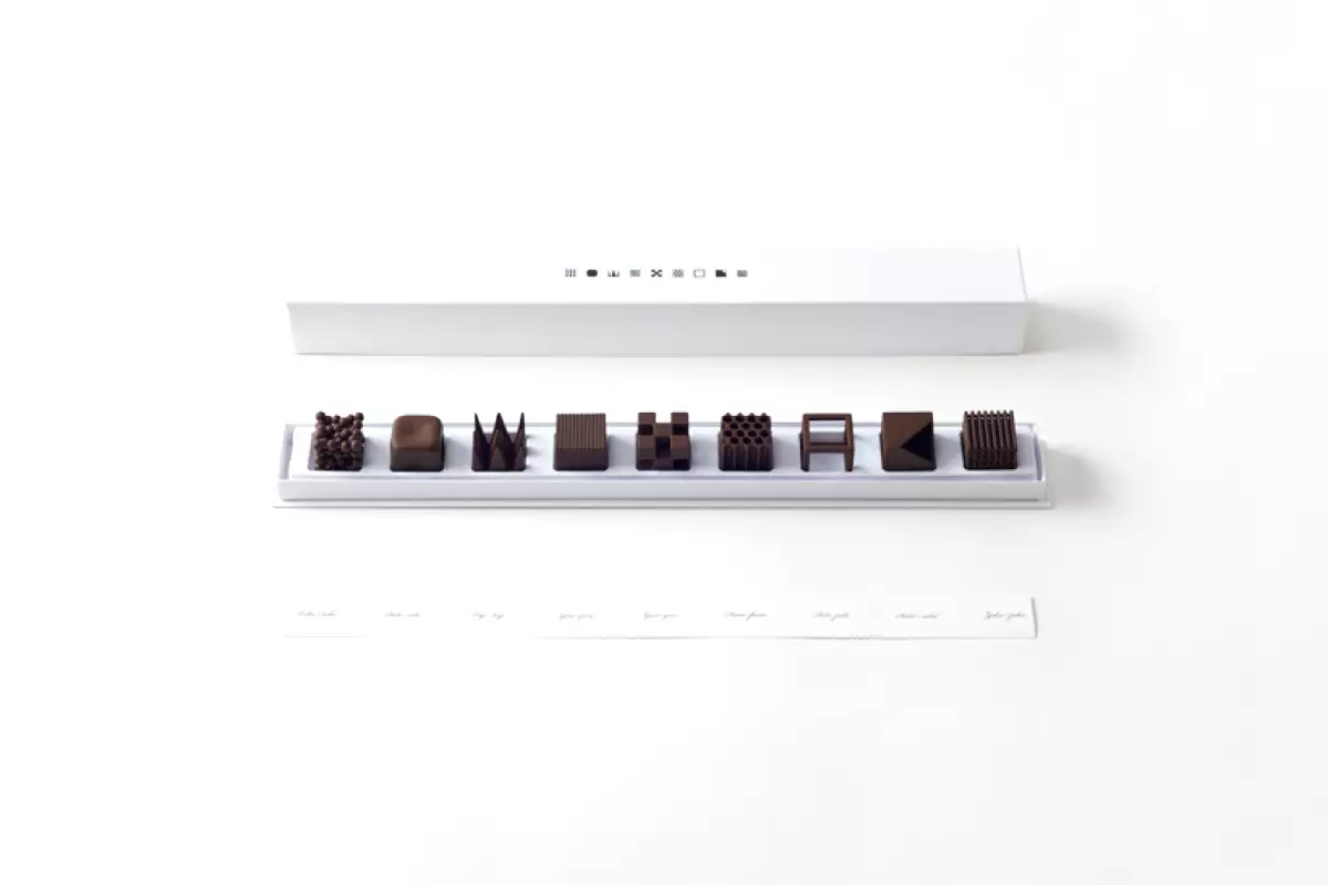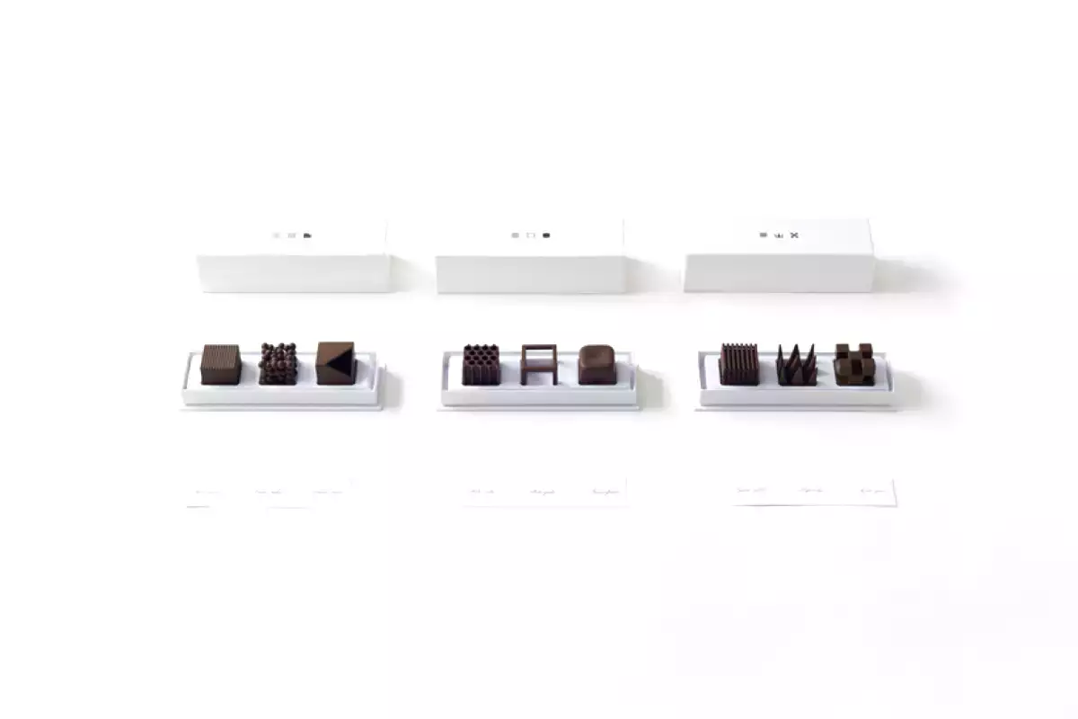 El proyecto que hizo, consistía en 9 tipos diferentes de chocolate de se realizaron dentro del mismo tamaño, 26x26x26 mm. La diferencia, la forma: con puntas afiladas, interiores huecos, texturas de superficie lisa o rugosa... Mientras que la materia prima es idéntica, las texturas crean diferentes emociones.