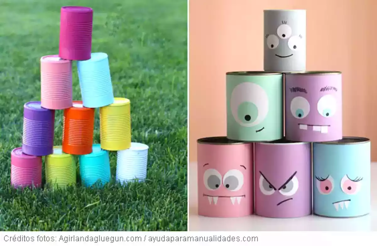 Para esta actividad necesitarás más de una lata cilíndrica. Podéis pintarlas con muñecos, monstruitos, números o como más os guste. Una vez que la pintura esté seca podréis disponerlas en horizontal para jugar a los bolos o en vertical, haciendo una pirámide y divertiros viendo quien tiene mejor puntería y derriba un mayor número de latas.