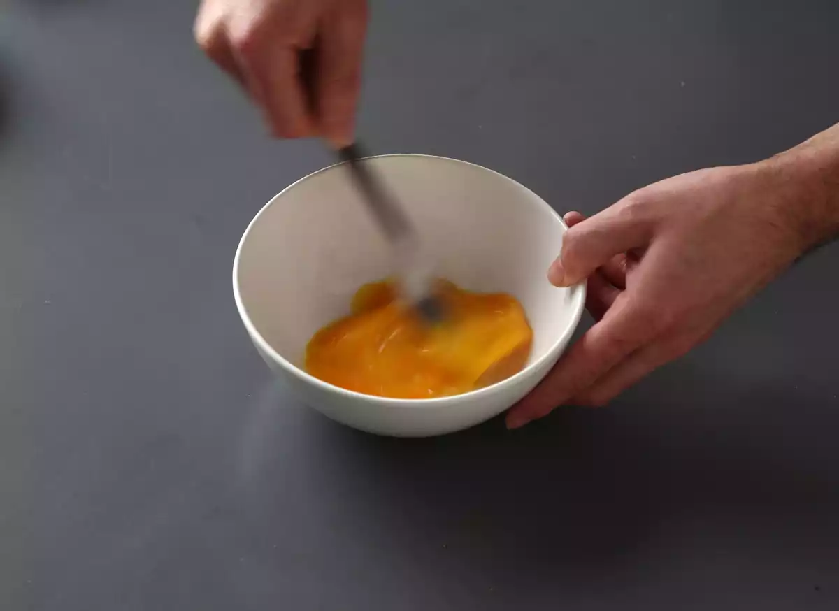 Poner un huevo entero y una yema en un bol. Batir todo como si fuera una tortilla.
