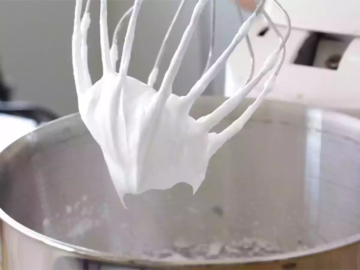 Con unas varillas (eléctricas o manuales) montar la clara del huevo junto a 50 gramos de azúcar. Cuando la batidora empiece a marcar su forma, añadiremos la otra mitad. Batir hasta que las claras formen picos cuando levantes la varilla.