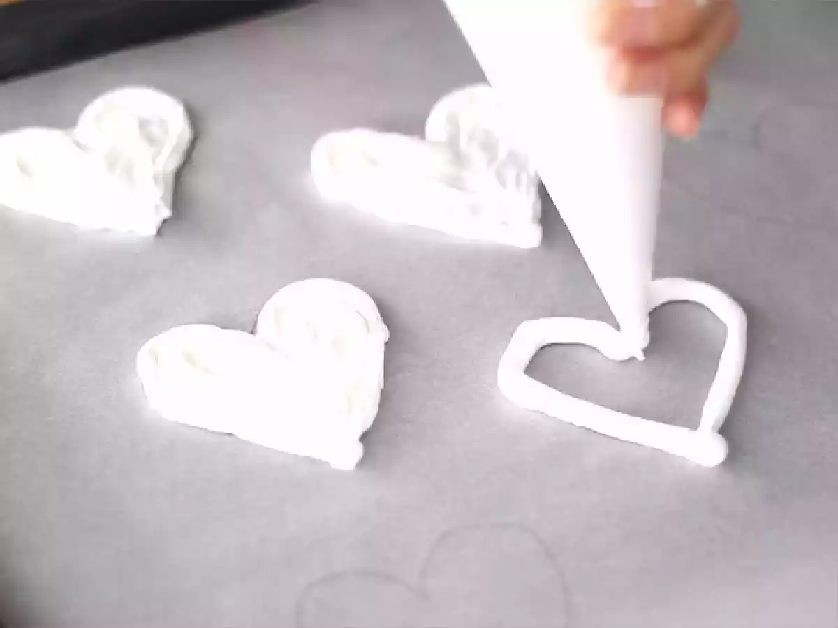 Dibuja corazones sobre el papel sulfurizado. Girar el papel dejando la tinta del rotulador debajo (para que no esté en contacto directo con el merengue). Después con ayuda de una manga pastelera formar corazones siguiendo la guía que hemos dibujado.