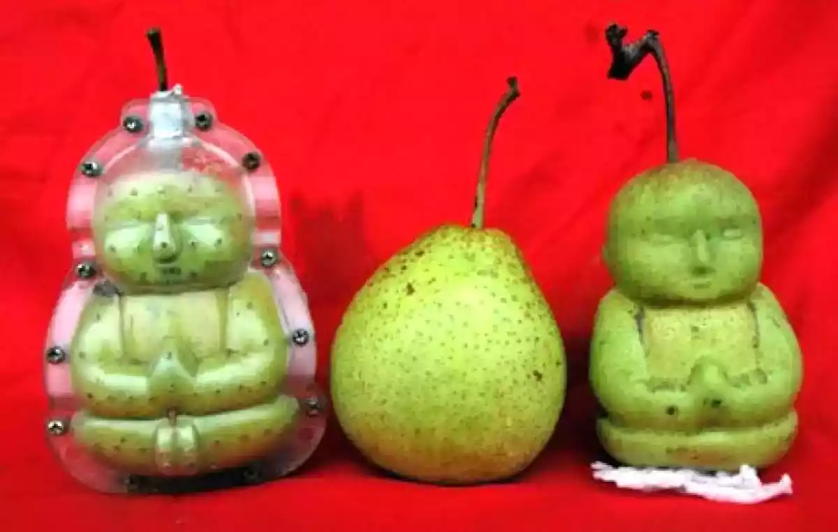 Aunque lo que más llama la atención, son las peras con forma de buda del granjero chino Hao Xianzhang propietario de un huerto al norte de Hebei. Lo consiguió después de 6 años gracias amoldes de fibra de vidrio y plástico, que permiten la entrada de luz (al ser transparentes) para un crecimiento natural.