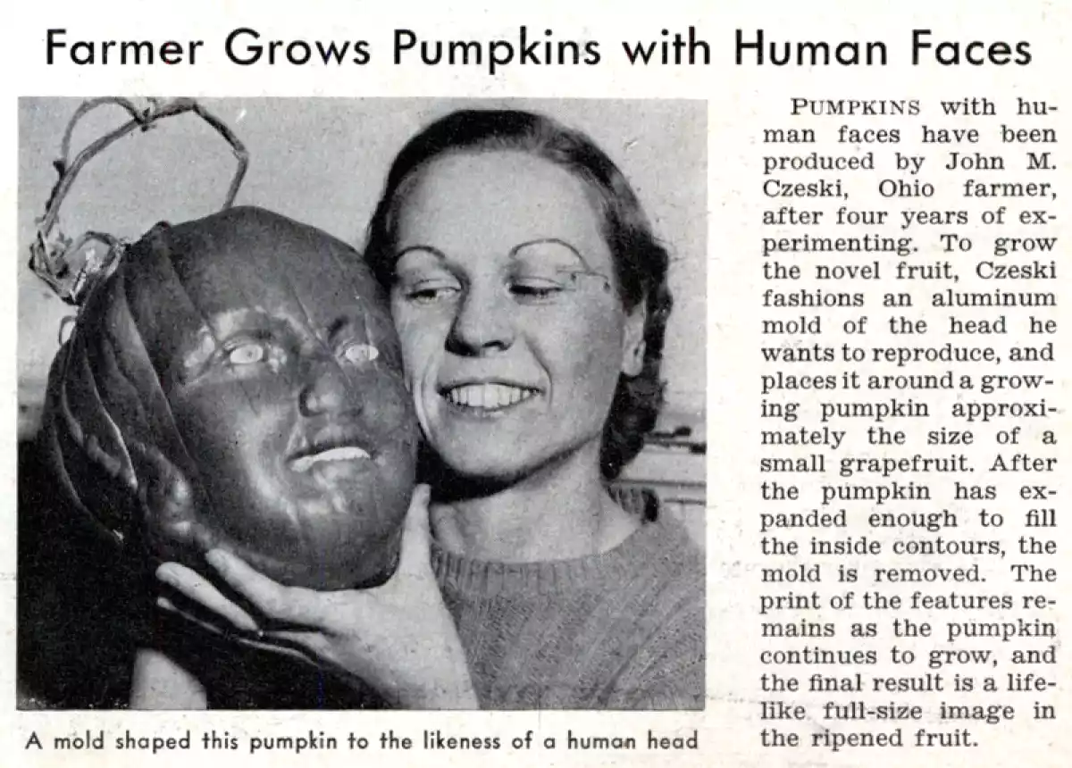 Cabe decir, que alguien mucho antes probó cambiar la forma de las hortalizas. En este caso, fue John M. Czeski, un granjero americano que vivía en Ohio. Quien en en 1938 cultivó una calabaza con forma de cara humana después de cuatro años de experimentación.