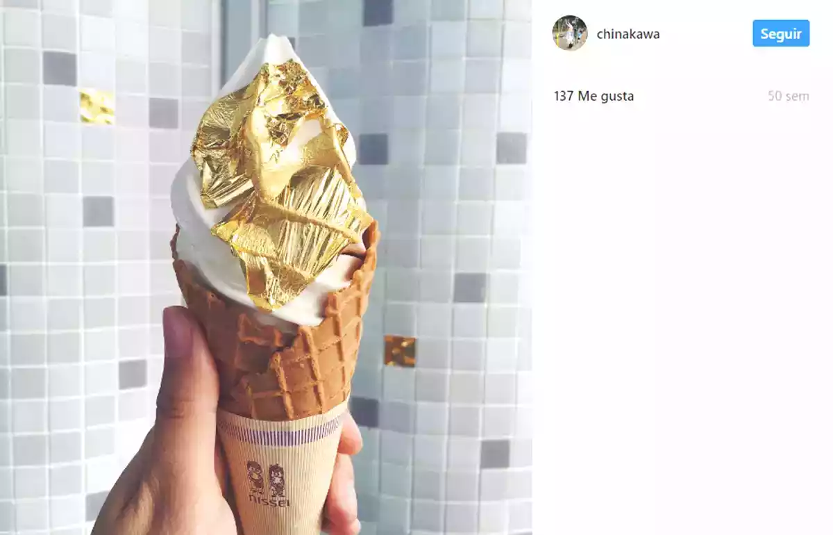 Japón nunca dejará de sorprendernos en cuanto a inventiva. Y esta vez, se les ha ocurrido la idea de ponerle láminas de oro (comestibles) a helados. Los que lo han probado dicen no ver diferencia de sabor entre el helado y el oro, pero eso no ha impedido su compra masiva. Sobre todo, cuando unes comida + instagram. Justo un segundo después de haberlo comprado, la gente echa fotos lo antes posible para colgarlo en su cuenta de instagram sin que se derrita y conseguir el mayor número de "likes".