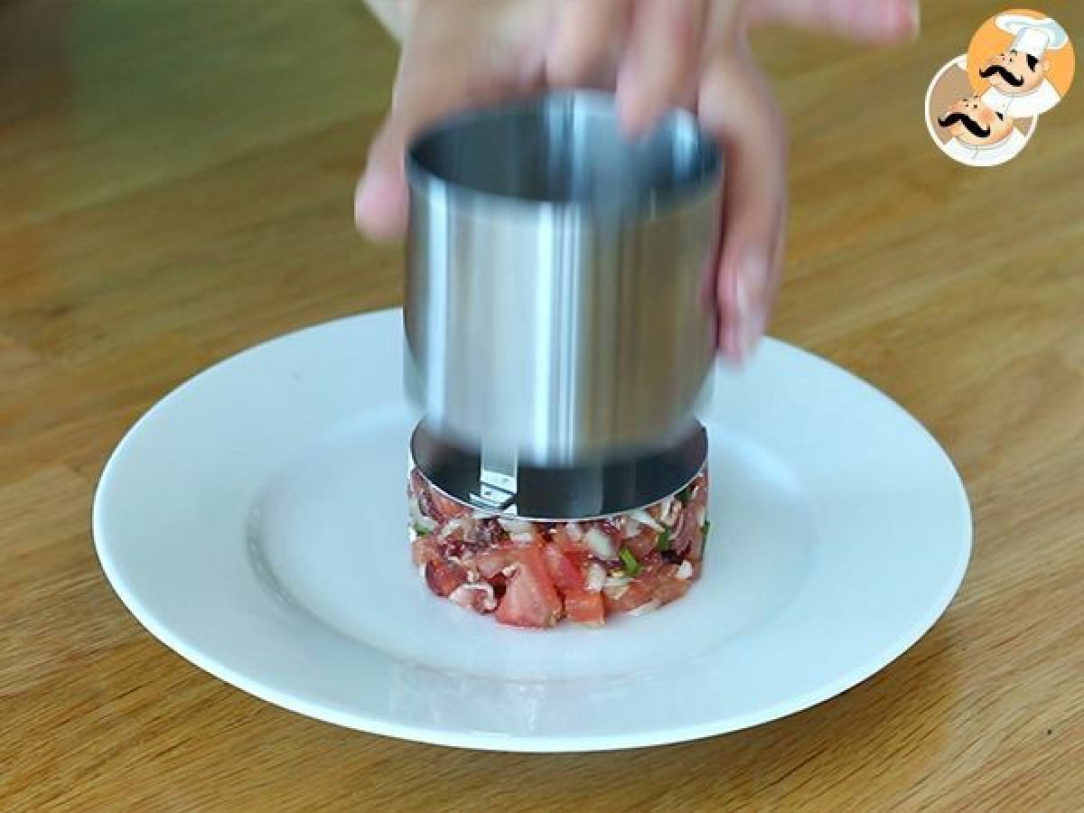 Para un emplatado bonito y apetitoso, vamos a utilizar un aro de cocina. Coloca el aro justo en el centro del plato y pon dentro el tartar. Presiona ligeramente con la tapa (si la tiene) o con los dedos para retirar el aro.