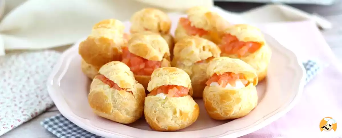 La masa choux, que no es ni más ni menos la masa que se usa en la lionesas, profiteroles, etc. queda genial también en las recetas saladas. En esta ocasión, hemos elegido una combinación que no falla nunca: salmón ahumado con queso fresco. Si quiere preparar esta receta en el último momento, puedes hacer los choux con antelación y guardarlos en el congelador. Sólo tendrás que rellenarlos en el último momento ;-)