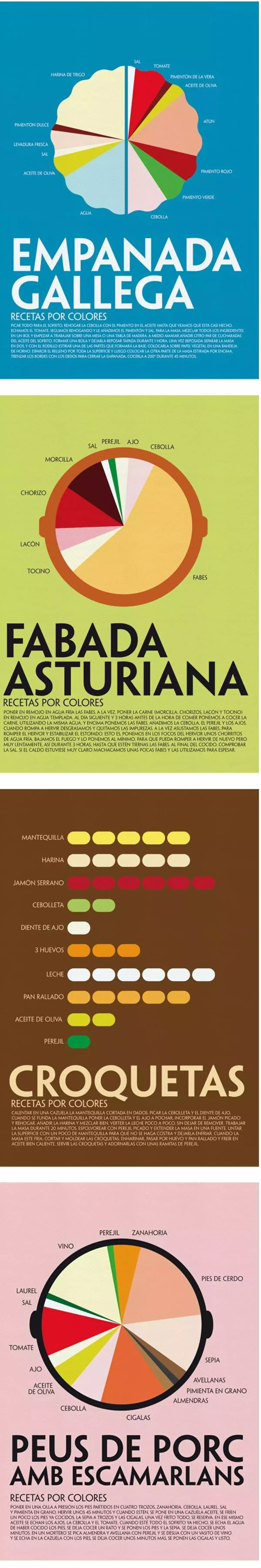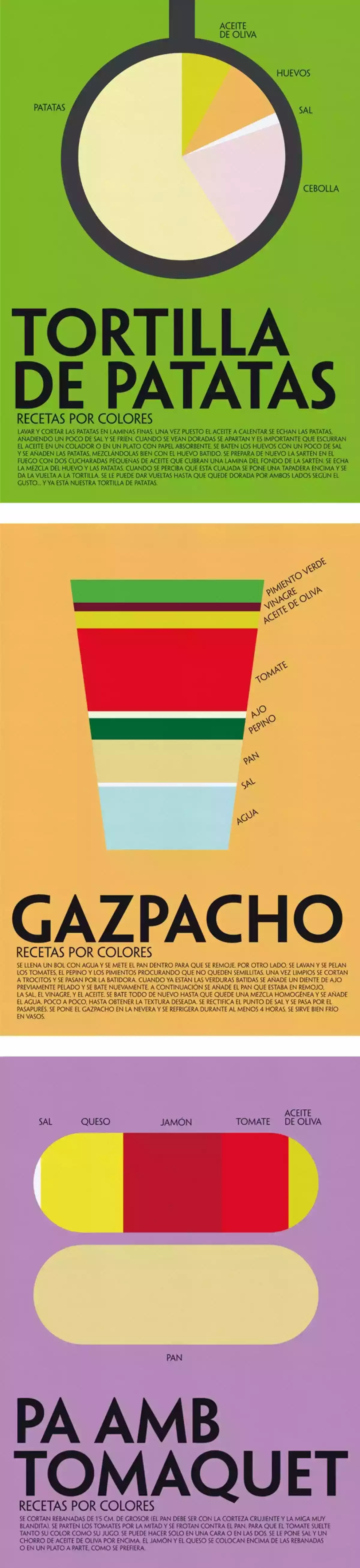 Una de las propuestas que más ha llamado la atención, han sido los carteles de la diseñadora Laura Valero. En su serie Recetas por Colores, la diseñadora ha creado ocho clásicos de la cocina española a modo de infografía. Las cantidades exactas que hay que añadir a la receta correspondiente, aparecen a modo de discos, gráficos, pirámides o distintas formas. Debajo, explica la receta en texto.