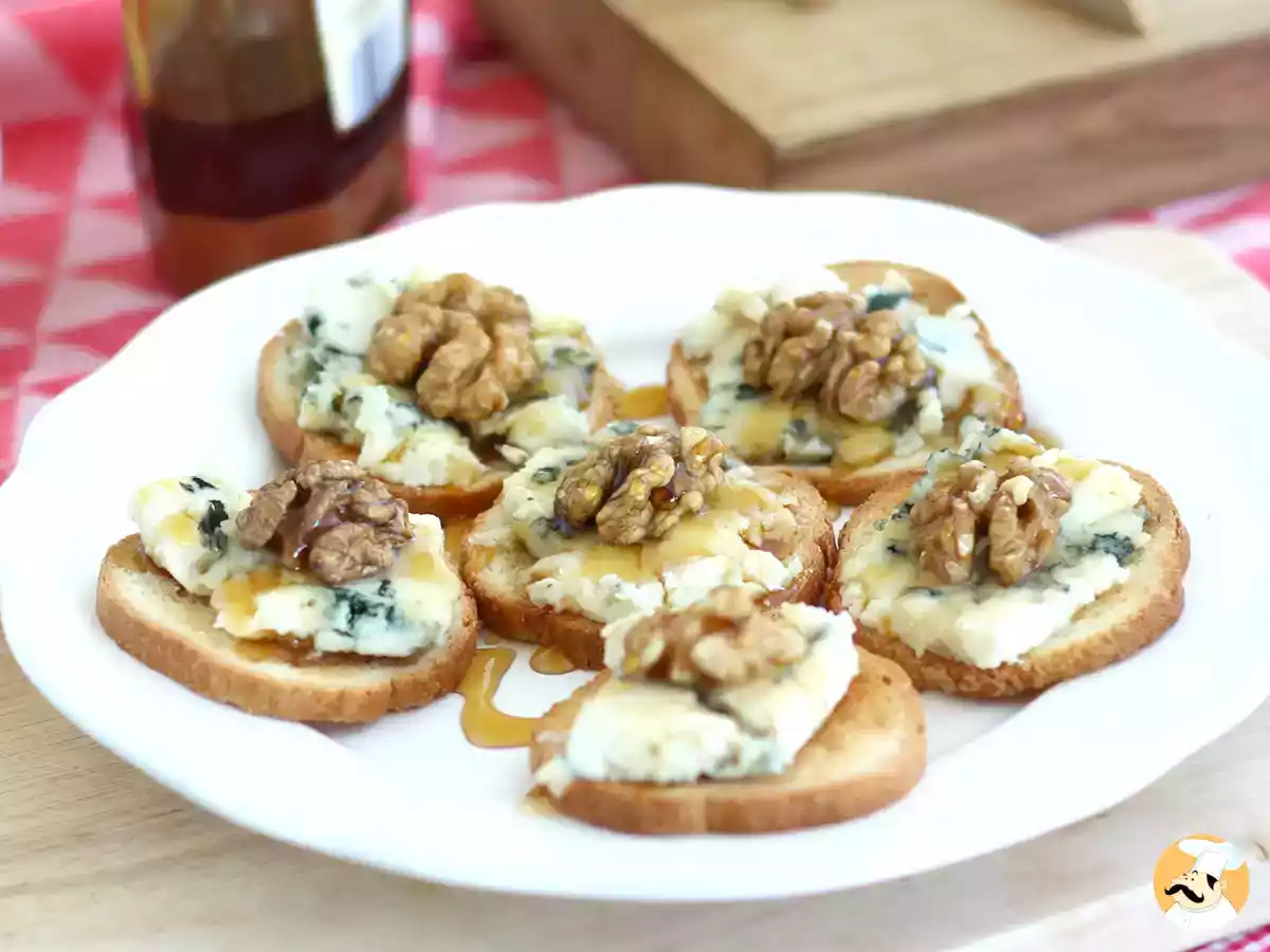 Tostas de roquefort, nueces y miel