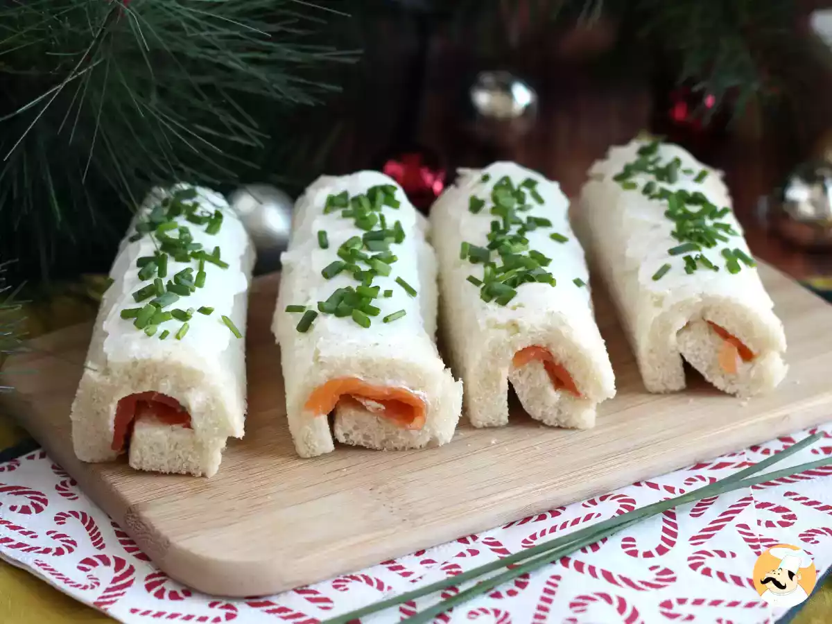 Retira la corteza de las rebanadas de pan de molde, aplánalas con un rodillo y unta una fina capa de queso crema. Coloca lonchas de salmón ahumado y enrolla firmemente. Corta en pequeños cilindros y sirve con cebollino picado por encima. Receta foto: Rollitos de salmón ahumado
