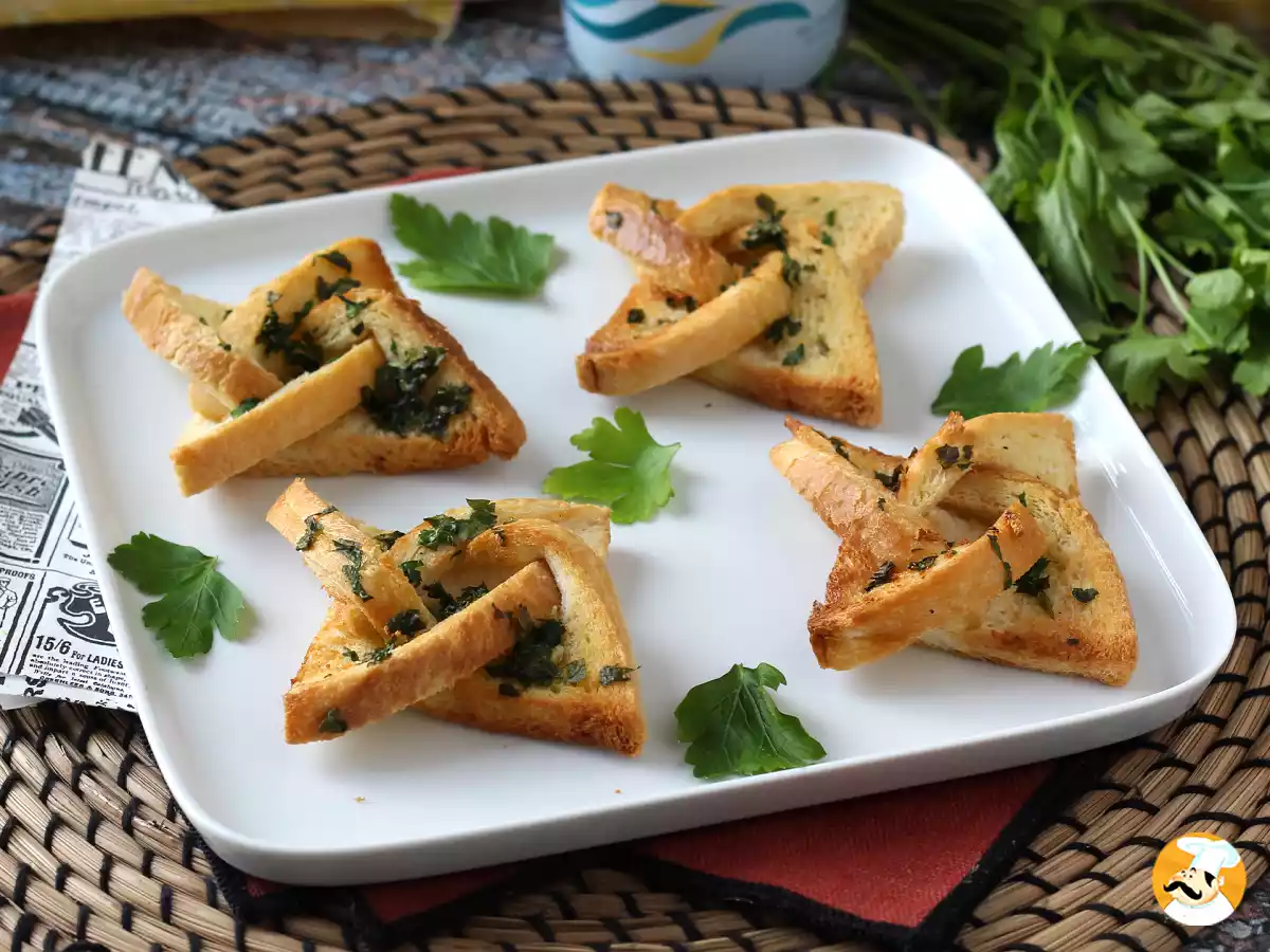 Un clásico reinventado. Corta las rebanadas de pan de molde en forma de estrella y unta con mantequilla de ajo casera. Hornéalas hasta que estén doradas y crujientes. Perfectas como acompañamiento de sopas o simplemente como un aperitivo irresistible. Receta foto: Pan de ajo con forma de estrella