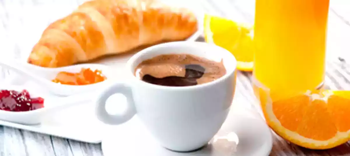 Básicamente se compone de un café + bollería, ya sea croissant, caracolas, napolitanas, baguette... Aunque en general es el croissant. A veces toman también zumo de naranja pero no es una normal general.